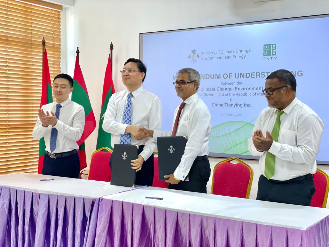 3月21日,中國(guó)天楹總裁曹德標(biāo)同馬爾代夫氣候變化、環(huán)境與能源部長(zhǎng)陶瑞克·易卜拉欣正式簽署合作備忘錄,雙方將努力協(xié)作,共同應(yīng)對(duì)氣候變化,在可持續(xù)發(fā)展、能源轉(zhuǎn)型、環(huán)境保護(hù)、循環(huán)經(jīng)濟(jì)以及低碳城市發(fā)展等議題上展開深度合作。