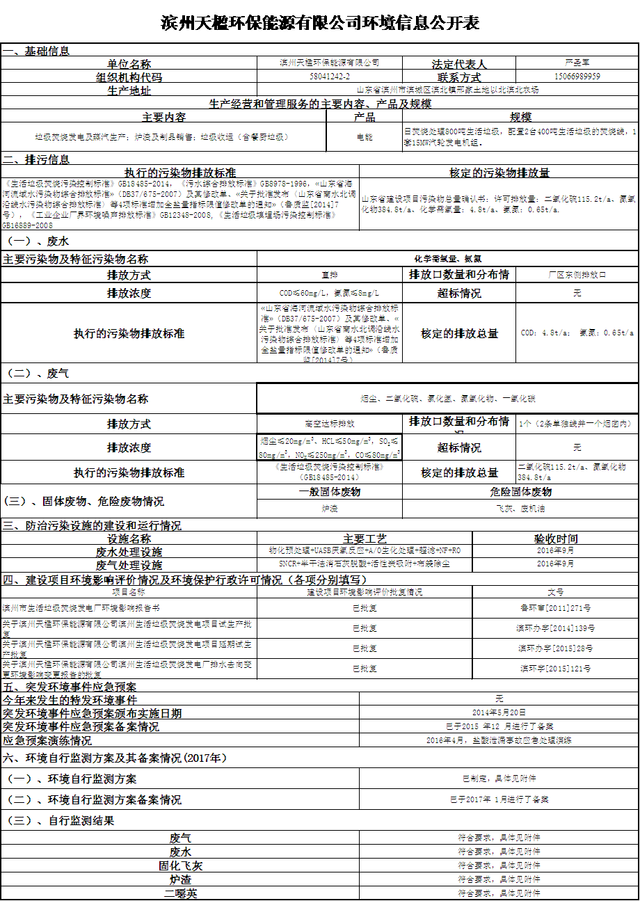 濱州天楹環(huán)保能源有限公司2017年環(huán)境信息公開表