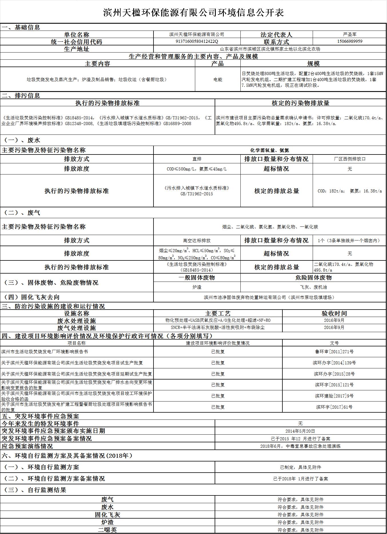 濱州天楹環(huán)保能源有限公司2018年環(huán)境信息公開表